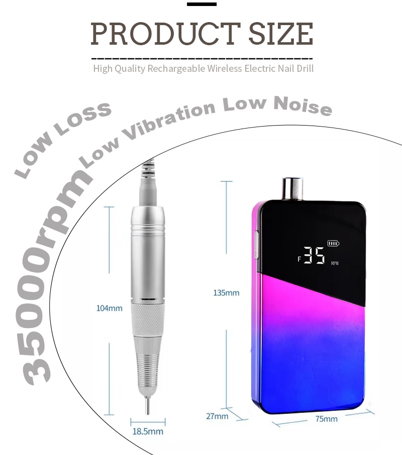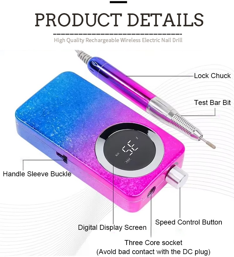 Дызайн дысплея гэтай электрычнай дрылі для пазногцяў з хуткасцю 30 000 абаротаў у хвіліну мае перамыкач уключэння/выключэння і кручэнне наперад/назад для актывацыі адной кнопкай, разетку для хуткай зарадкі ўнізе, зменную разетку для свердзела ўверсе і рэгуляванне хуткасці ў трох пазіцыях для задавальнення розных патрэб.