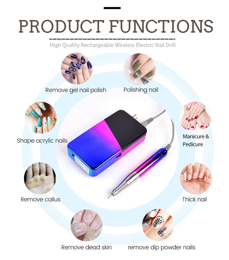Гэта электрычная дрыль для пазногцяў з хуткасцю 30 000 абаротаў у хвіліну мае 2 колеры на выбар: чорны/белы/шэры/сіні/чырвоны/ружовы/аранжавы, маляўнічыя колеры.