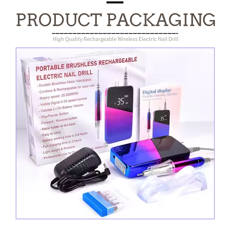 Змест гэтай электрычнай дрылі для пазногцяў з хуткасцю 30 000 абаротаў у хвіліну ўключае шліфавальную ручку, USB-кабель для зарадкі, інструкцыю па эксплуатацыі прадукту і лёгкую партатыўны скрыню.