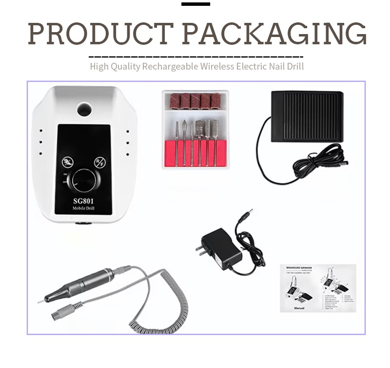 Змест гэтай электрычнай партатыўнай электрычнай дрылі для гелевых пазногцяў з хуткасцю 35 000 абаротаў у хвіліну змяшчае шліфавальную ручку, USB-кабель для зарадкі, інструкцыю па эксплуатацыі прадукту і лёгкую партатыўны скрыню.
