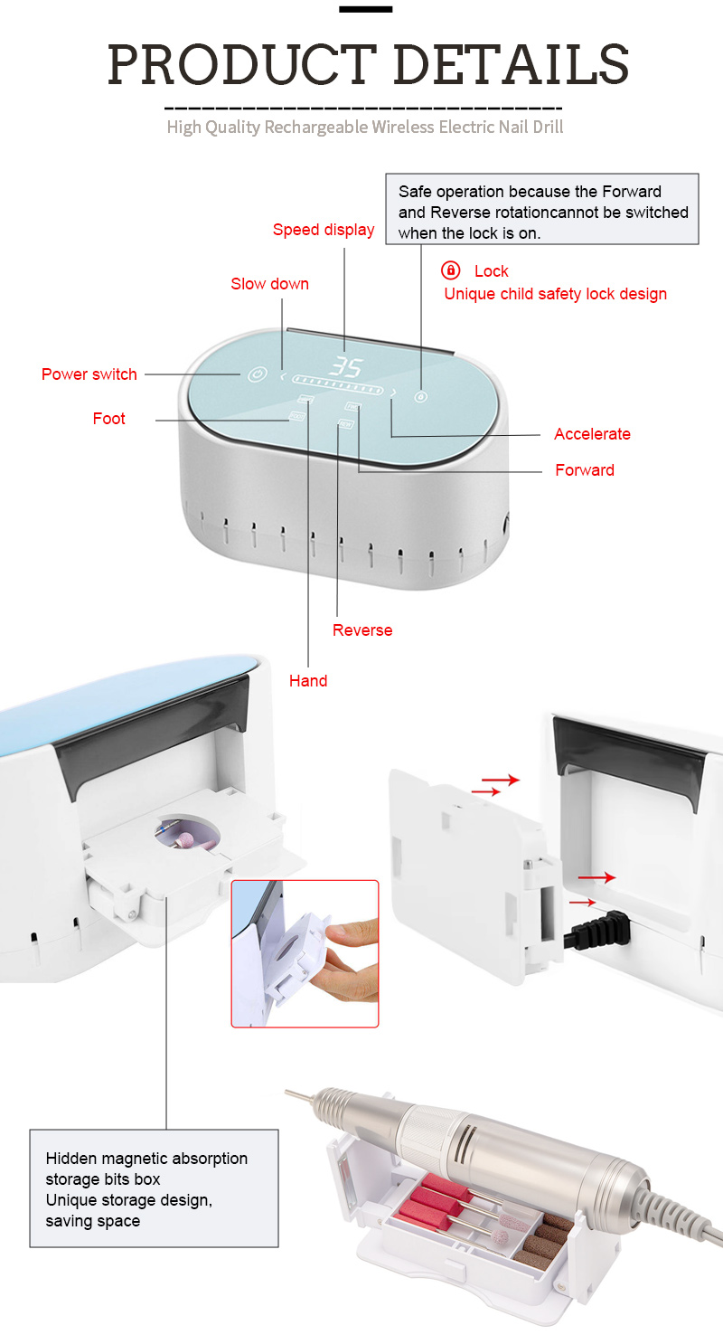 Набор акумулятарных бесправадных дрыляў для пазногцяў Near Me USB 45 Вт 35000 абаротаў у хвіліну