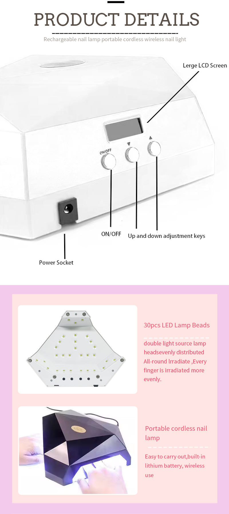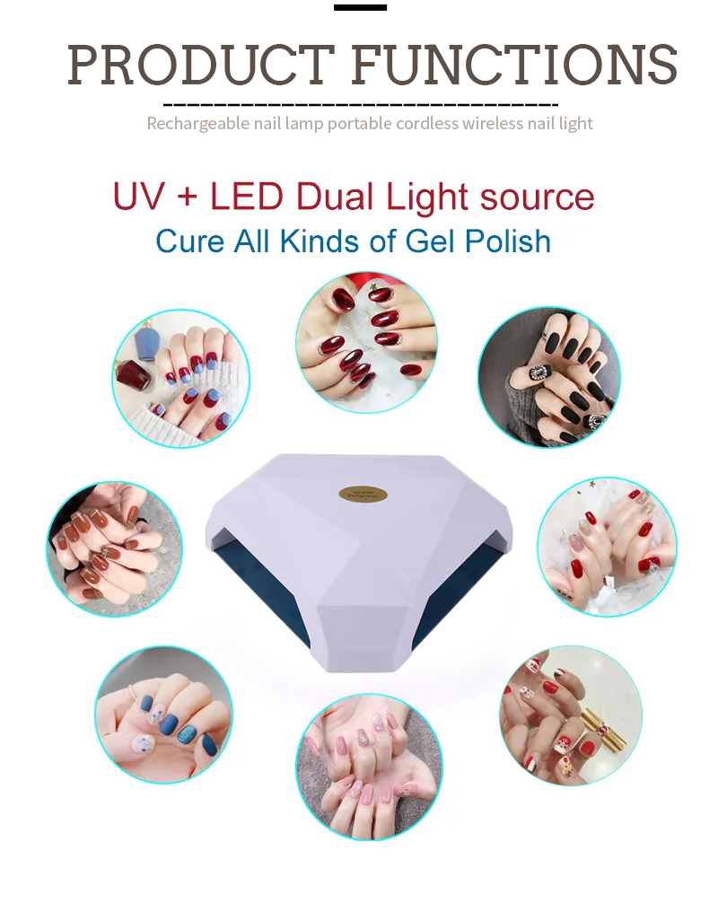Прадукт забяспечвае нават сушкі клею без усаджвання. Яго падвойныя крыніцы святла забяспечваюць далікатнае ацяпленне, каб прадухіліць змяненне колеру рук і напружанне вачэй, прыдатны для рук, і для ног, даючы надзвычай хуткае вынікі сушкі.