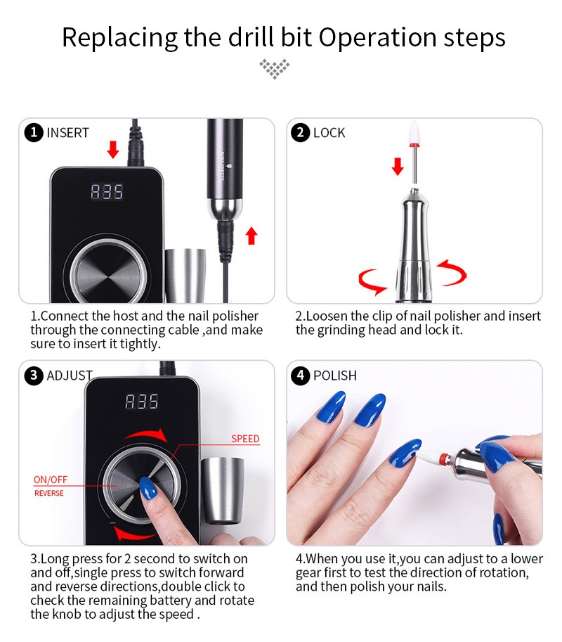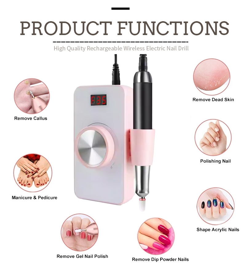 Гэта адслойваецца 35000 абаротаў у хвіліну электрычная дрыль для пазногцяў, метад працы свердзела, гэта значыць, падключыце і выцягніце, лёгка і зручна, замена можа быць выкарыстана пасля завяршэння.