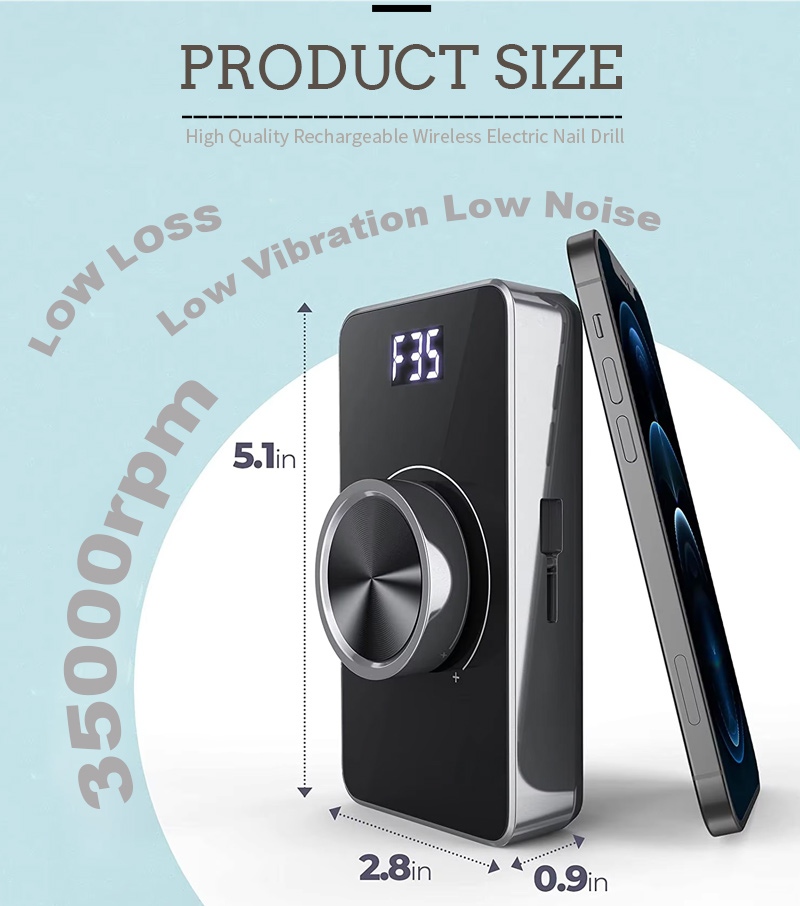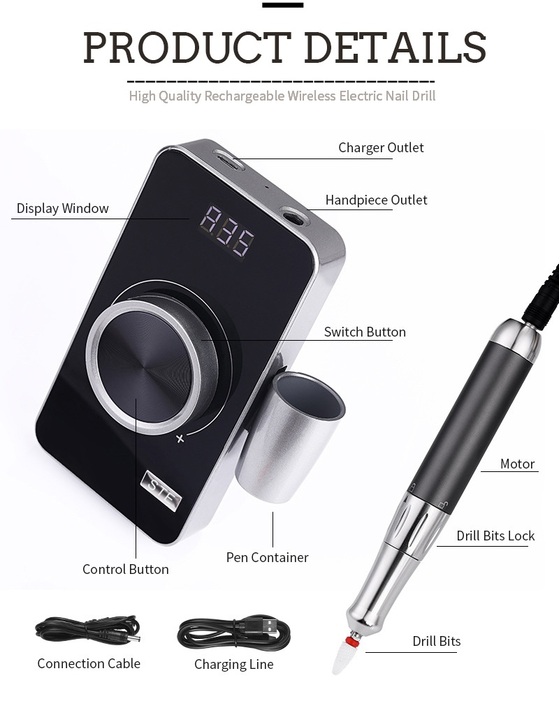 Дызайн дысплея гэтай адслойваючай электрычнай дрылі для пазногцяў з хуткасцю 35 000 абаротаў у хвіліну мае пераключальнік уключэння/выключэння і кручэнне наперад/назад для актывацыі адной кнопкай, разетку для хуткай зарадкі ўнізе, зменную разетку для свердзела ўверсе і рэгуляванне хуткасці ў трох пазіцыях для задавальнення розных патрэб.
