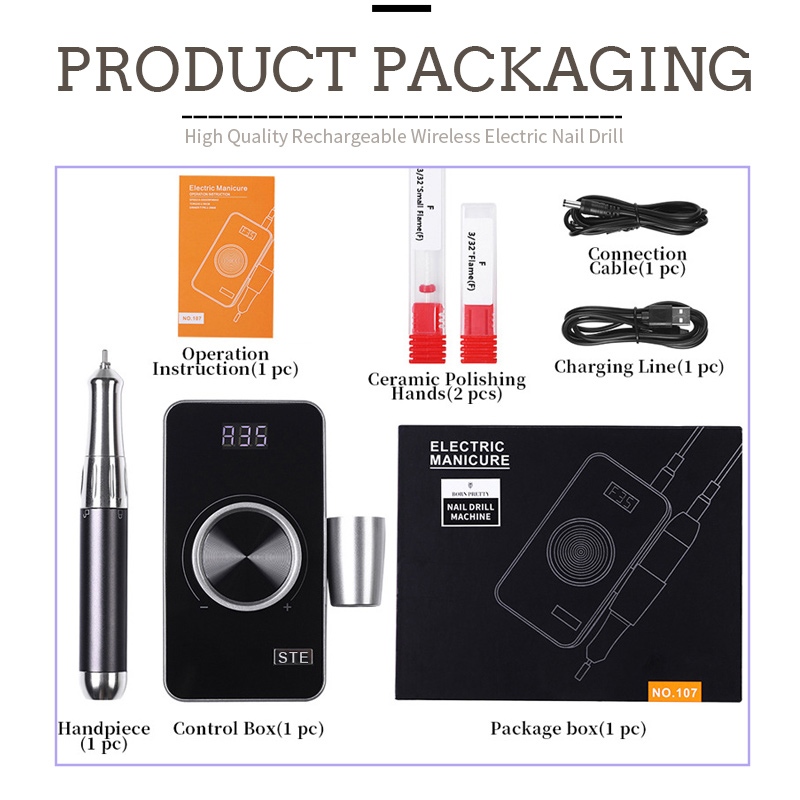 Змесціва гэтай адслойваючай электрычнай дрылі для пазногцяў з хуткасцю 35 000 абаротаў у хвіліну змяшчае шліфавальную ручку, USB-кабель для зарадкі, інструкцыю па эксплуатацыі прадукту і лёгкую партатыўны скрыню.