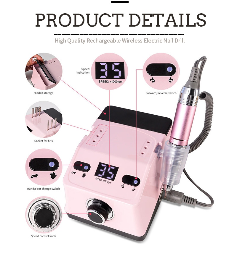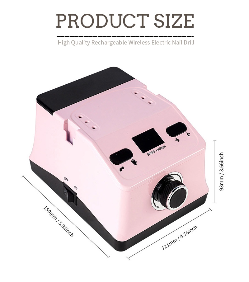 Канструкцыя дысплея гэтай ручной дрылі і паліроўшчыка пазногцяў мае перамыкач уключэння/выключэння і кручэнне наперад/назад для актывацыі адной кнопкай, разетку для хуткай зарадкі ўнізе, зменную разетку для свердзела ўверсе і рэгуляванне хуткасці ў трох пазіцыях для задавальнення розных патрэб.