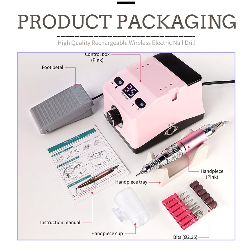 Змест гэтай ручной дрылі і паліроўкі для пазногцяў уключае шліфавальную ручку, USB-кабель для зарадкі, інструкцыю па эксплуатацыі прадукту і лёгкую партатыўны скрыню.
