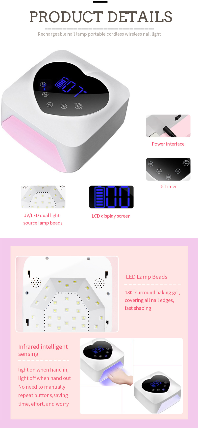 Прадукт забяспечвае нават сушкі клею без усаджвання. Яго падвойныя крыніцы святла забяспечваюць далікатнае ацяпленне, каб прадухіліць змяненне колеру рук і напружанне вачэй, прыдатны для рук, і для ног, даючы надзвычай хуткае вынікі сушкі.