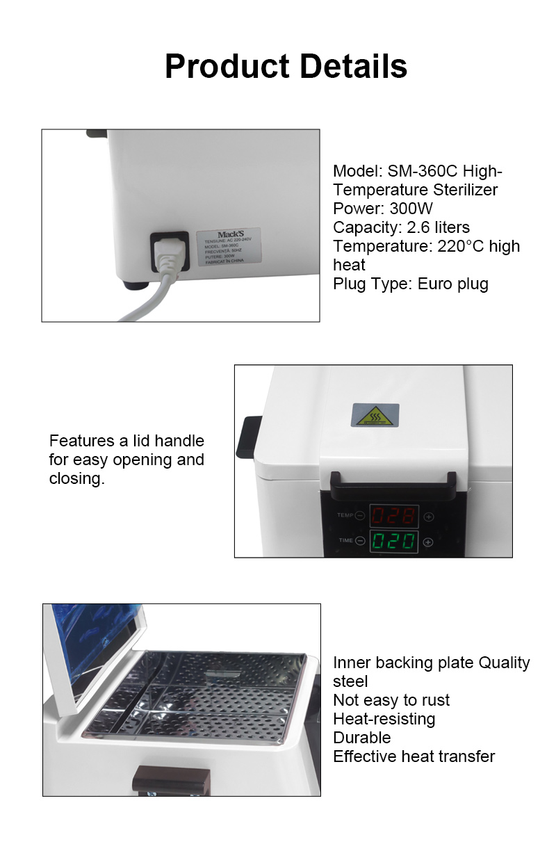 Гэты стэрылізатар у асноўным выпрацоўвае цяпло праз награвальнае кольца, выкарыстоўваючы высокія тэмпературы для дэзінфекцыі.