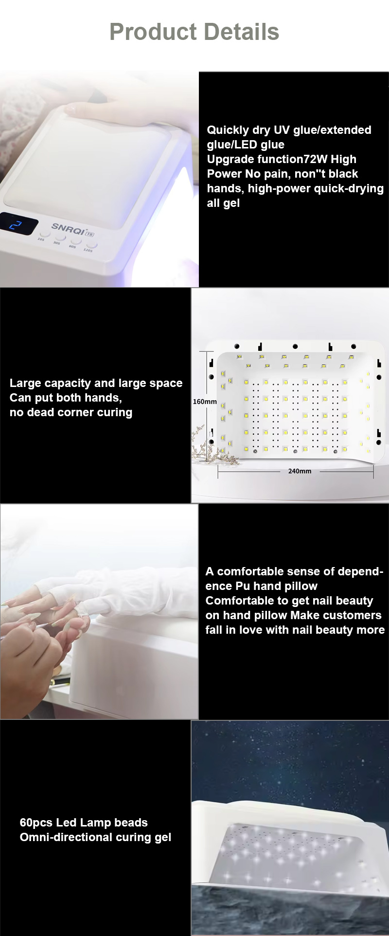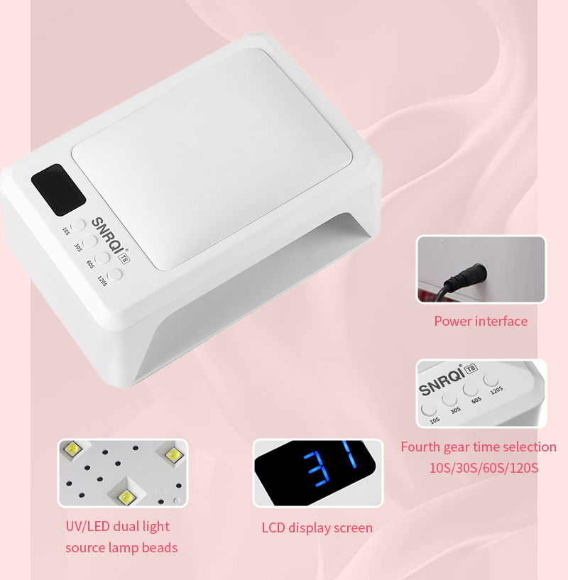 Прадукт забяспечвае раўнамернае высыханне клею без ўсаджвання. Яго падвойныя крыніцы святла забяспечваюць мяккі нагрэў, каб прадухіліць змяненне колеру рук і напружанне вачэй, падыходзяць як для рук, так і для ног, забяспечваючы надзвычай хуткі вынік сушкі.