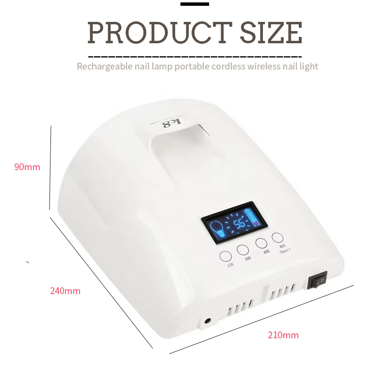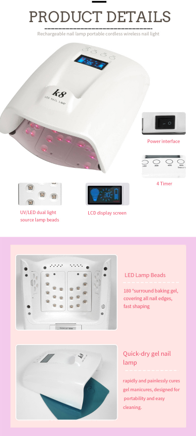 Вялікая ёмістая лямпа для сушкі пазногцяў з ручкай забяспечвае раўнамернае высыханне клею без усаджвання. Яго двайныя крыніцы святла забяспечваюць мяккі нагрэў, каб прадухіліць змяненне колеру рук і напружанне вачэй, падыходзяць як для рук, так і для ног, забяспечваючы надзвычай хуткі вынік сушкі.
