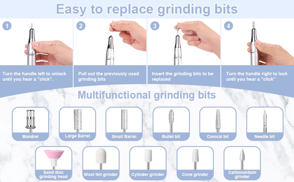 Гэта малашумны партатыўны камплект свердзела для пазногцяў метад працы свердзела, гэта значыць, падключыў і выцягні, лёгка і зручна, замена можа быць выкарыстана пасля завяршэння.