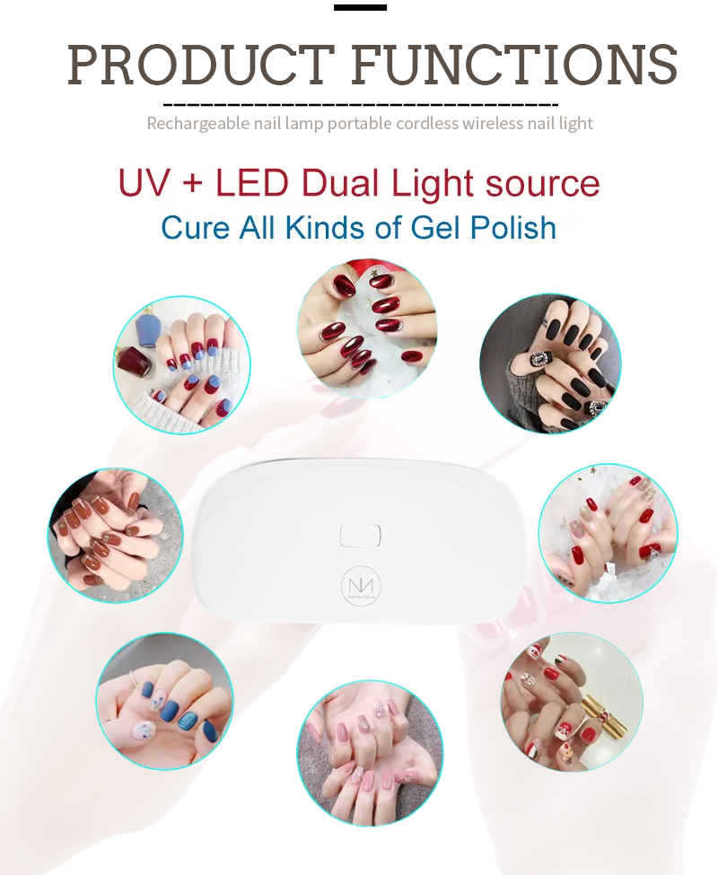 Прадукт забяспечвае раўнамернае высыханне клею без ўсаджвання. Яго двайныя крыніцы святла забяспечваюць мяккі нагрэў, каб прадухіліць змяненне колеру рук і напружанне вачэй, падыходзяць як для рук, так і для ног, забяспечваючы надзвычай хуткі вынік сушкі.