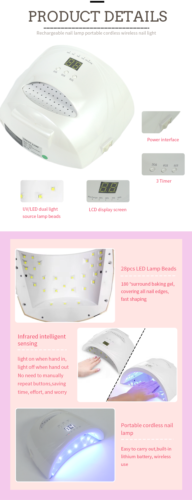 Прадукт забяспечвае нават сушкі клею без усаджвання. Яго падвойныя крыніцы святла забяспечваюць далікатнае ацяпленне, каб прадухіліць змяненне колеру рук і напружанне вачэй, прыдатны для рук, і для ног, даючы надзвычай хуткае вынікі сушкі.