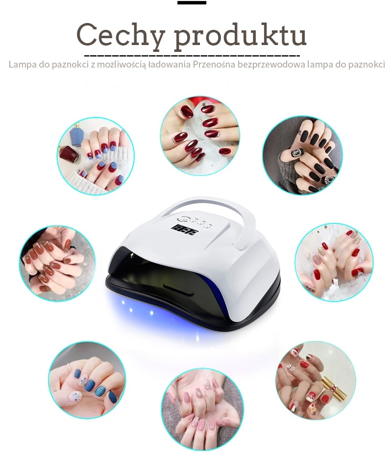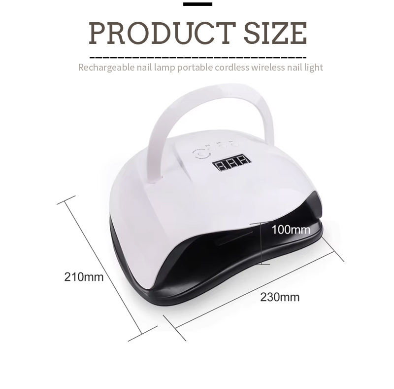 Пераносная лямпа для сушкі пазногцяў забяспечвае раўнамернае высыханне клею без ўсаджвання. Яго двайныя крыніцы святла забяспечваюць мяккі нагрэў, каб прадухіліць змяненне колеру рук і напружанне вачэй, падыходзяць як для рук, так і для ног, забяспечваючы надзвычай хуткі вынік сушкі.