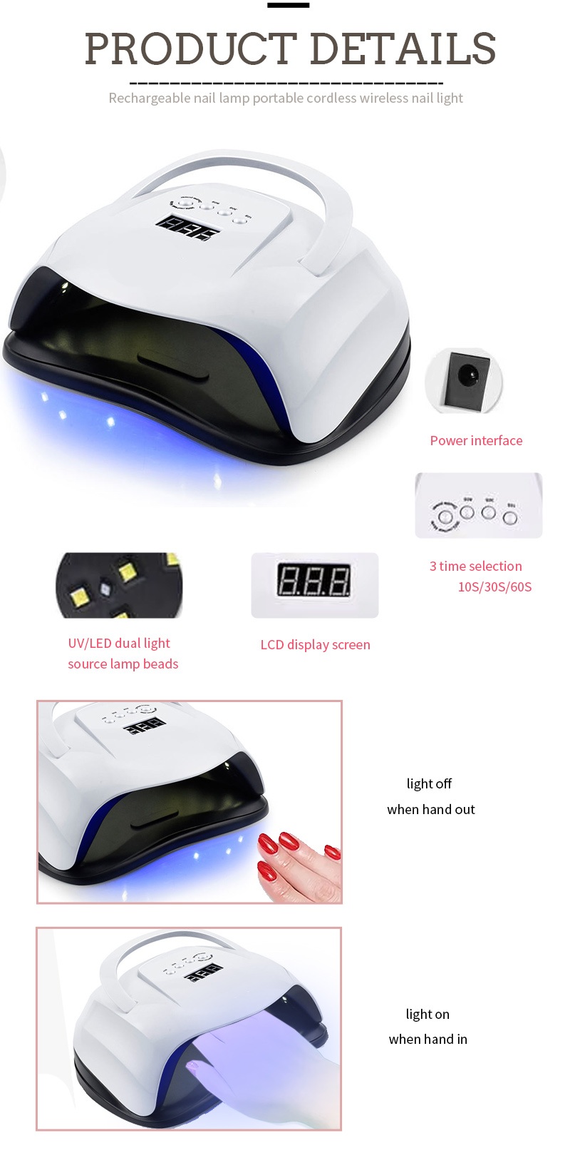 Партатыўная лямпа для сушкі пазногцяў мае тэхналогію інфрачырвонага разумнага зандзіравання, якая аўтаматычна загараецца, калі рукі набліжаюцца, і выключаецца, калі рукі адыходзяць, пазбаўляючы ад шматразовага націскання кнопак і эканомячы час і сілы. Моцны клей для выпечкі не патрабуе доўгага чакання, што дазваляе зэканоміць час і сілы.