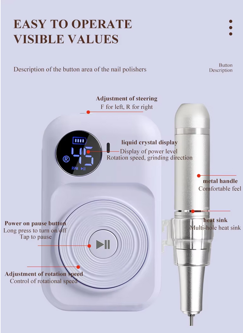 Гэта прэміум малашумная канструкцыя дысплея для шліфавальнай ручкі, з гняздом для шліфавальнай ручкі, вадкакрысталічны ВК-дысплей можа паказваць колькасць абаротаў/магутнасць/кірунак, ручку пераключальніка хуткасці, кнопку пераключэння па гадзіннікавай стрэлцы/супраць гадзіннікавай стрэлкі, кнопку паўзы, прафесійны рухавік 30 000 абаротаў у хвіліну, шліфавальную галоўку з шрубавай фіксацыяй.