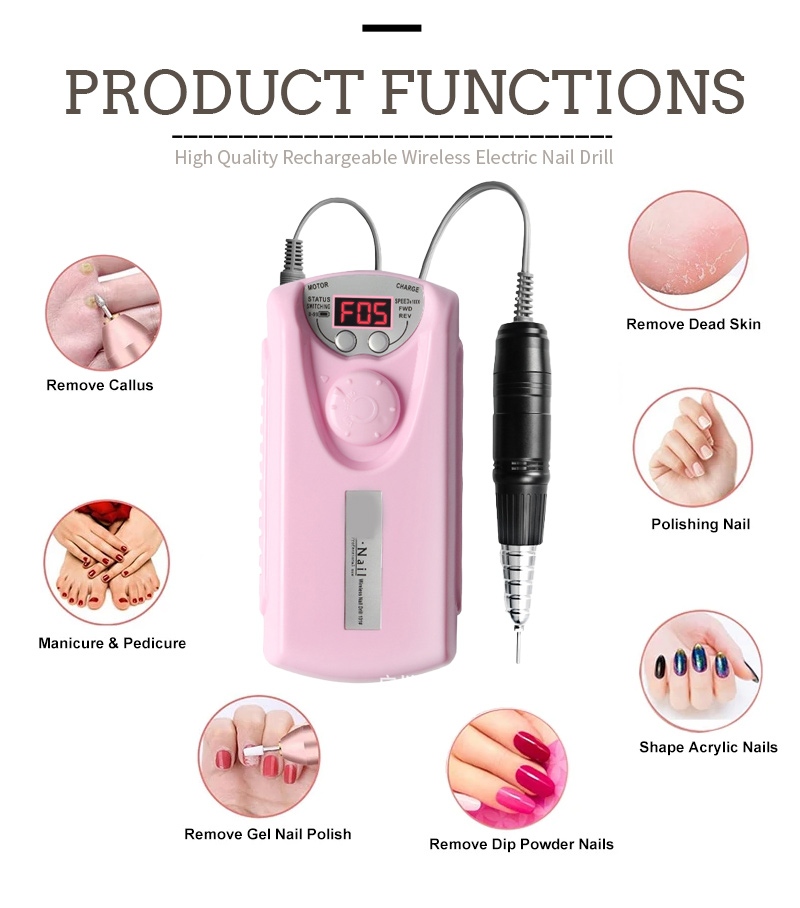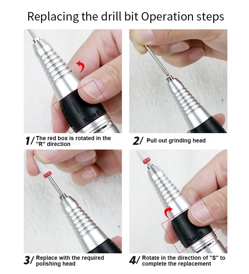 Гэта прафесійная акумулятарная электрычная дрыль для пазногцяў, метад працы замены свердзела, гэта значыць, падключыць і выцягнуць, лёгка і зручна, замена можа быць выкарыстана пасля завяршэння.