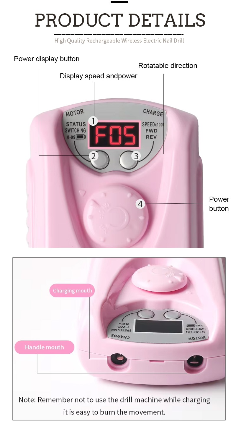 Дызайн дысплея гэтай прафесійнай акумулятарнай электрычнай дрылі для пазногцяў мае перамыкач уключэння/выключэння і паварот наперад/назад для актывацыі адной кнопкай, разетку для хуткай зарадкі ўнізе, зменную разетку для свердзела ўверсе і рэгуляванне хуткасці ў трох пазіцыях для задавальнення розных патрэб.