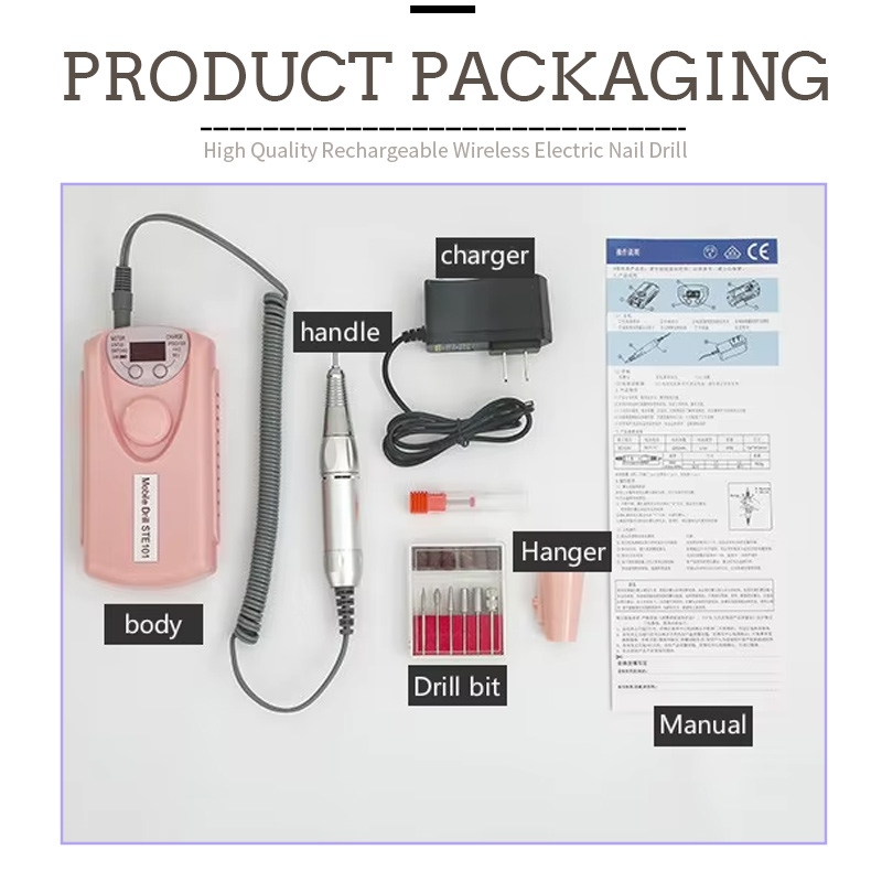 Змест гэтай прафесійнай акумулятарнай электрычнай дрылі для пазногцяў у камплекце змяшчае шліфавальную ручку, USB-кабель для зарадкі, інструкцыю па эксплуатацыі прадукту і лёгкую партатыўны скрыню.