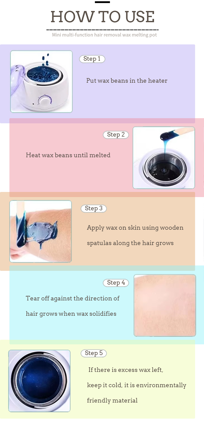 Спосаб працы прадукту з воскам для дэпіляцыі: чым вышэй тэмпература, тым хутчэй растае воск, чым ніжэй тэмпература, тым павольней растае воск, спачатку ўліце ў адпаведную колькасць васковых зерняў для дэпіляцыі, награвайце, пакуль васковыя зерні не растануць, потым часткі воску для дэпіляцыі з раўнамерным пакрыццём для дэпіляцыі і, нарэшце, адрывайце ў напрамку росту валасоў.