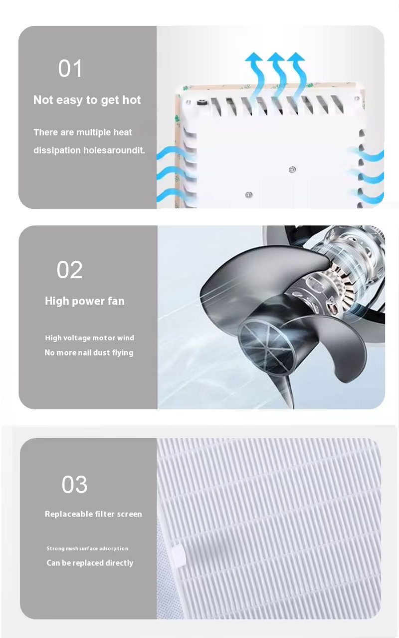 У ніжняй частцы прадукту ёсць адтуліны для астуджэння для бесперабойнай вентыляцыі, а пыласос распрацаваны з некалькімі вентыляцыйнымі адтулінамі для астуджэння ўнізе і вакол, каб забяспечыць бесперабойную вентыляцыю і падоўжыць тэрмін службы прылады.
