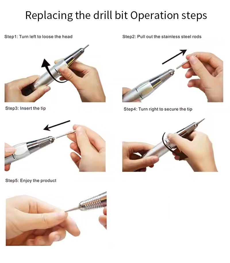 Гэты прафесійны партатыўны свердзел для пазногцяў 35 000 абаротаў у хвіліну метад працы замены свердзела, гэта значыць, падключыў і выцягні, лёгка і зручна, замена можа быць выкарыстана пасля завяршэння.