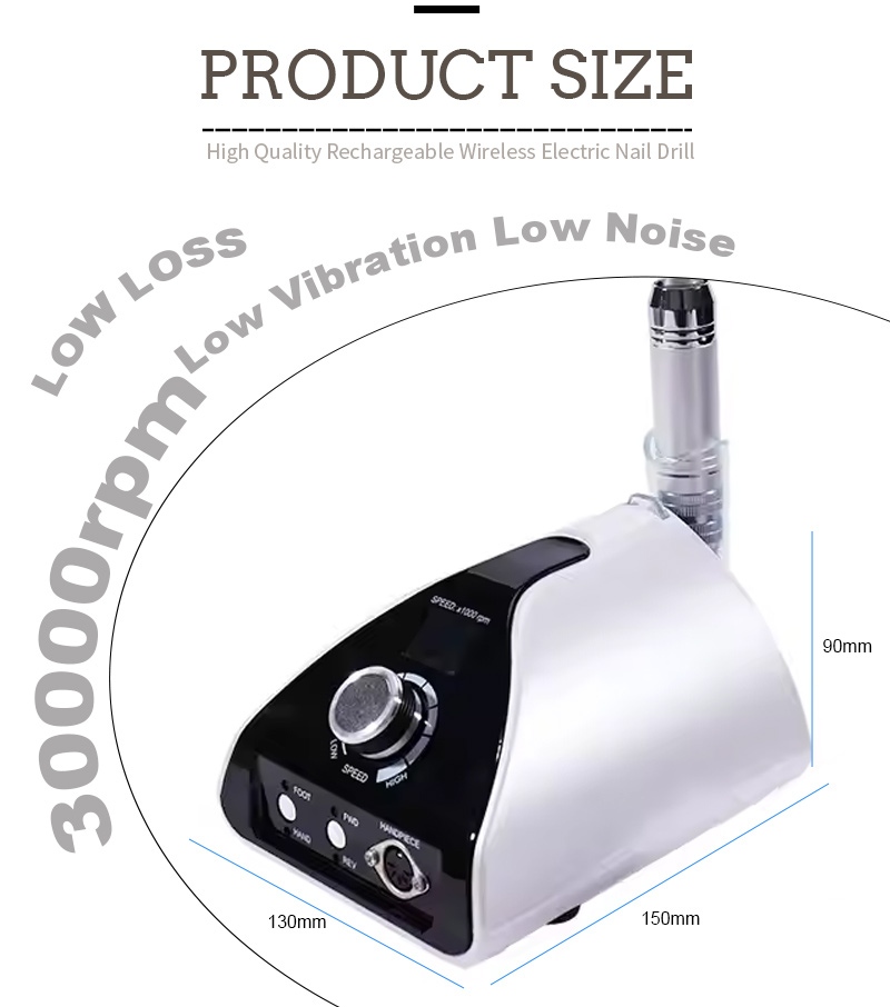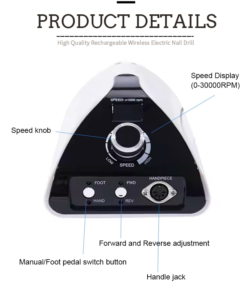 Дызайн дысплея гэтай прафесійнай партатыўнай машыны для свідравання пазногцяў 35 000 абаротаў у хвіліну мае пераключальнік уключэння/выключэння і кручэнне наперад/назад для актывацыі адной кнопкай, разетку для хуткай зарадкі ўнізе, зменную разетку для свердзела ўверсе і рэгуляванне хуткасці ў трох пазіцыях для задавальнення розных патрэб.
