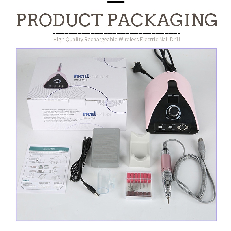 Змест гэтай прафесійнай партатыўнай дрыль-машыны для пазногцяў 35 000 абаротаў у хвіліну ўключае ў сябе шліфавальную ручку, USB-кабель для зарадкі, інструкцыю па эксплуатацыі прадукту і лёгкую партатыўны скрынку.