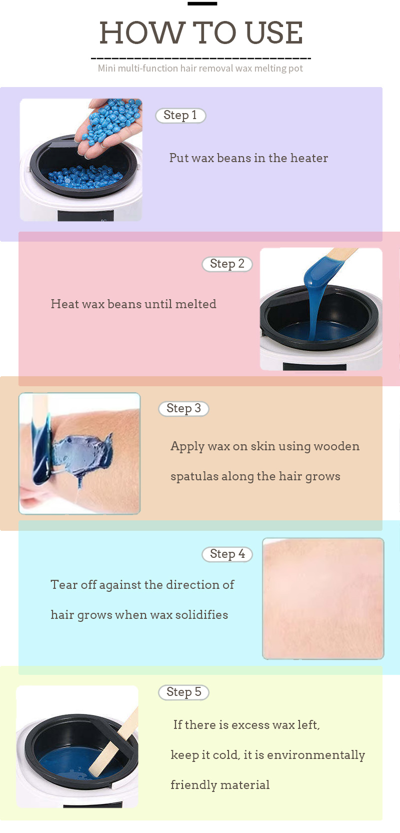 Спосаб працы прадукту з воскам для дэпіляцыі: чым вышэй тэмпература, тым хутчэй растае воск, чым ніжэй тэмпература, тым павольней растае воск, спачатку ўліце ў адпаведную колькасць васковых зерняў для дэпіляцыі, награвайце, пакуль васковыя зерні не растануць, потым часткі воску для дэпіляцыі з раўнамерным пакрыццём для дэпіляцыі і, нарэшце, адрывайце ў напрамку росту валасоў.