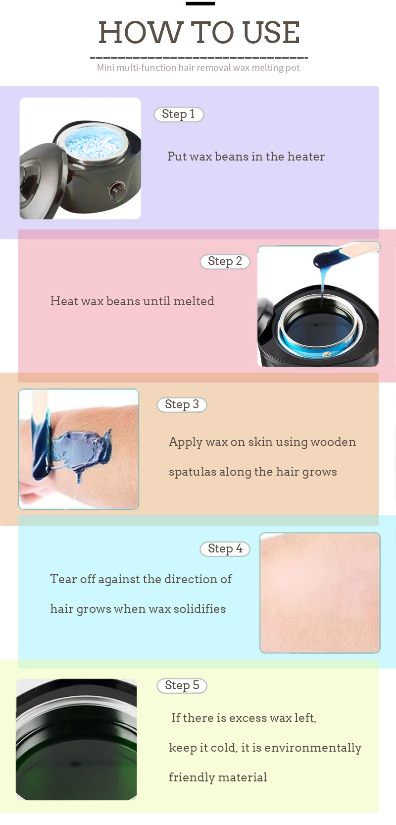 Спосаб працы прадукту з воскам для дэпіляцыі: чым вышэй тэмпература, тым хутчэй растае воск, чым ніжэй тэмпература, тым павольней растае воск, спачатку ўліце ў адпаведную колькасць васковых зерняў для дэпіляцыі, награвайце, пакуль васковыя зерні не растануць, потым часткі воску для дэпіляцыі з раўнамерным пакрыццём для дэпіляцыі і, нарэшце, адрывайце ў напрамку росту валасоў.