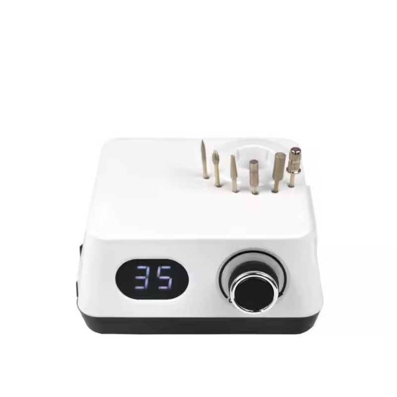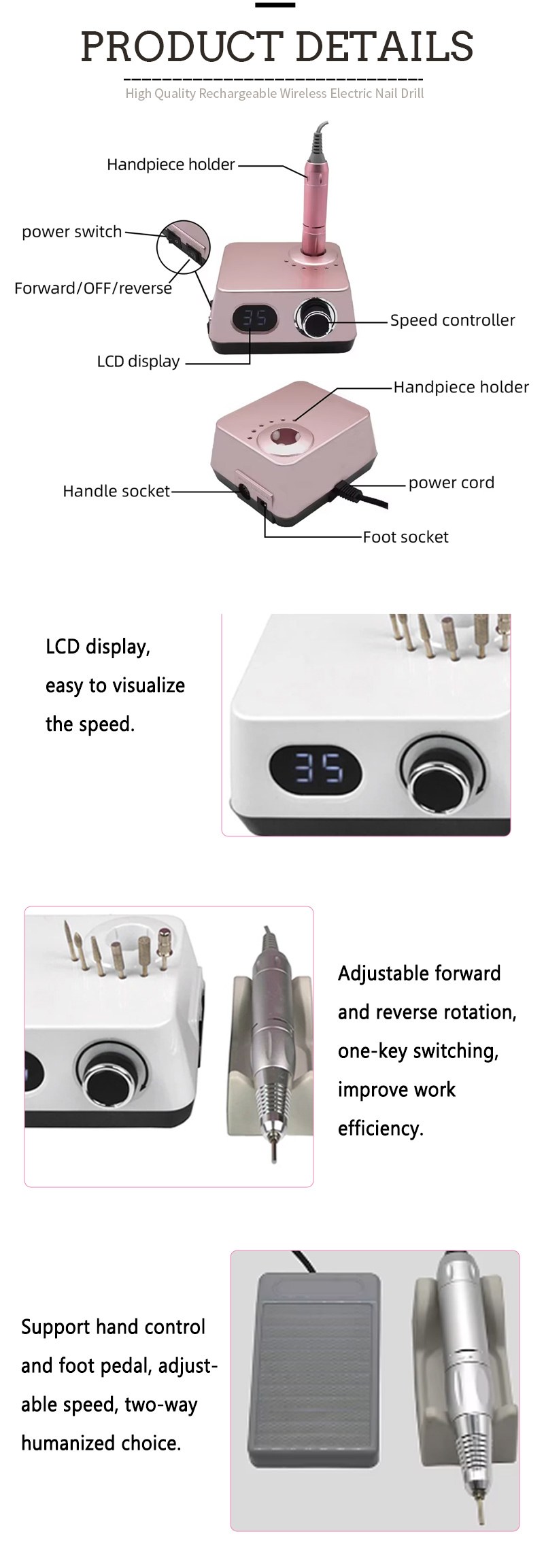 Дызайн дысплея гэтай бесправадной электрычнай дрылі для пазногцяў з хуткасцю 35 000 абаротаў у хвіліну мае пераключальнік уключэння/выключэння і кручэнне наперад/назад для актывацыі адной кнопкай, разетку для хуткай зарадкі ўнізе, зменную разетку для свердзела ўверсе і рэгуляванне хуткасці ў трох пазіцыях для задавальнення розных патрэб.