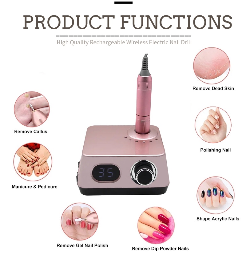 Гэта бесправадная электрычная дрыль для пазногцяў з 35 000 абаротаў у хвіліну мае 2 колеры на выбар: чорны/белы/шэры/сіні/чырвоны/ружовы/аранжавы, маляўнічыя колеры.