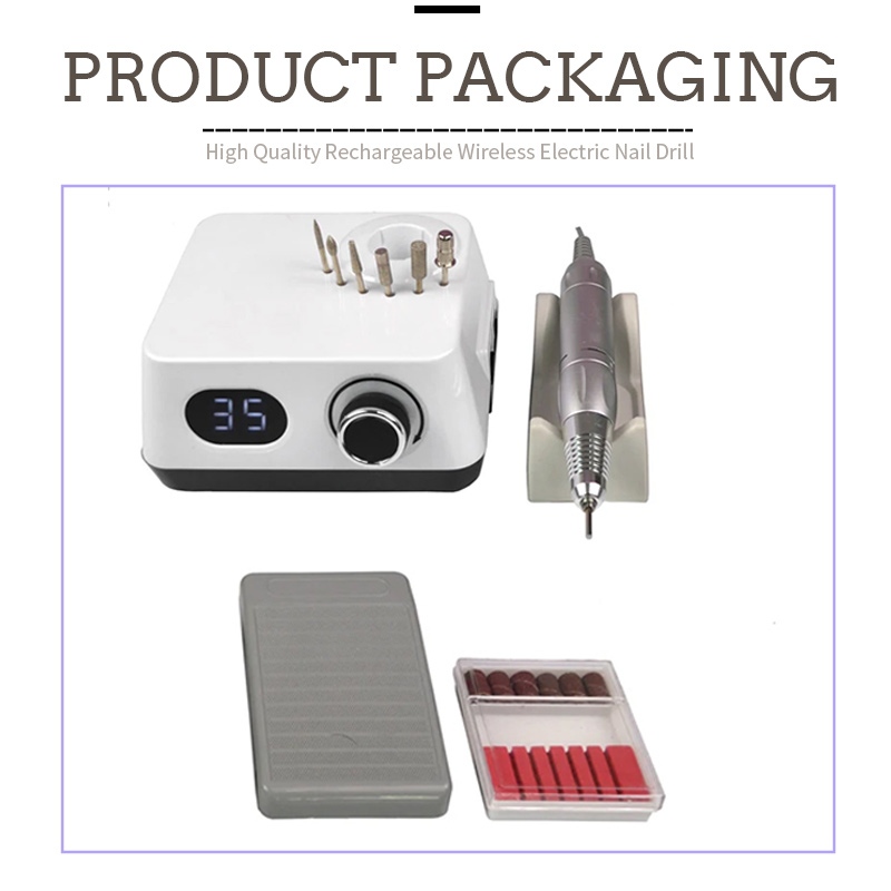 У камплект гэтай бесправадной электрычнай дрылі для пазногцяў з хуткасцю 35 000 абаротаў у хвіліну ўваходзяць шліфавальная ручка, USB-кабель для зарадкі, інструкцыя па эксплуатацыі прадукту і лёгкая партатыўная скрынка.
